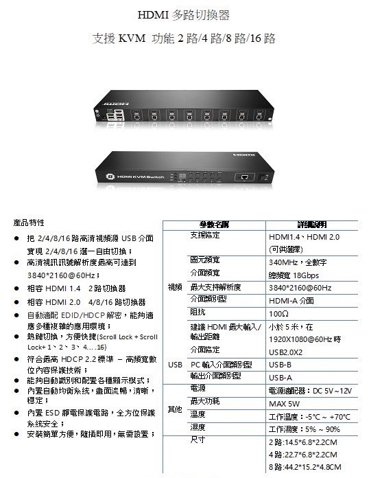 ●相容HDMI2.0 4/8/16路切換器