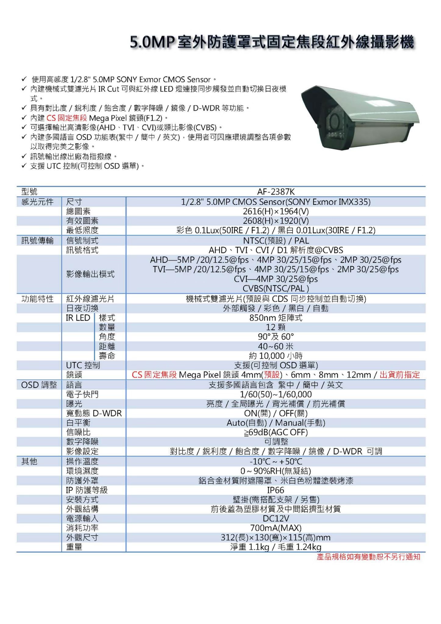 ● 內建機械式雙濾光片 IR Cut 可與紅外線 LED燈連接同步觸發並自動切換日夜模式